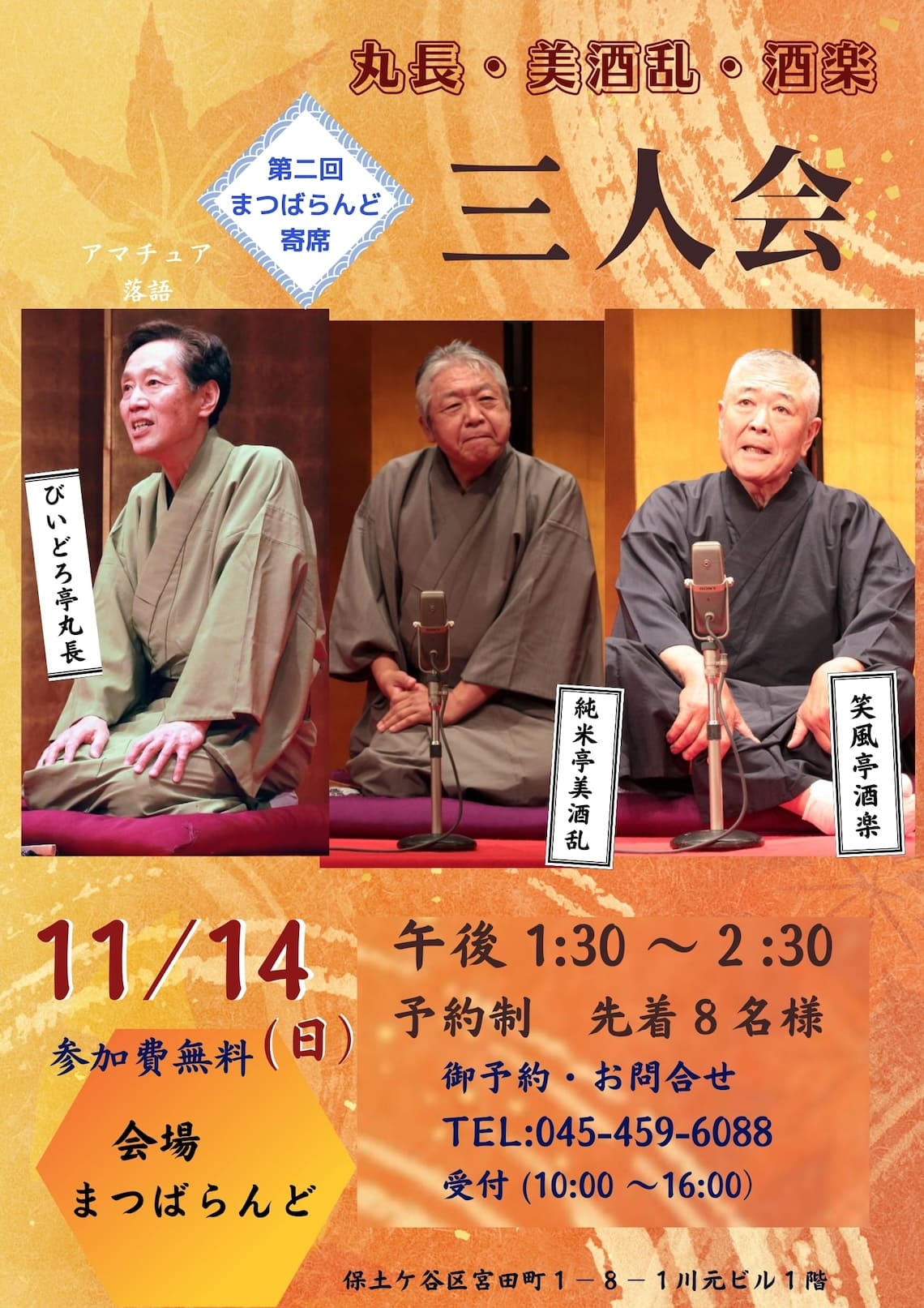 アマチュア落語家3名をお迎えし、第2回目「まつばらんど寄席3人会」を開催しました。お三人は、普段は第二の人生を楽しんでおり、お声がかかればどこへでも気軽に出かけ自慢の「お題」で噺しをされています。