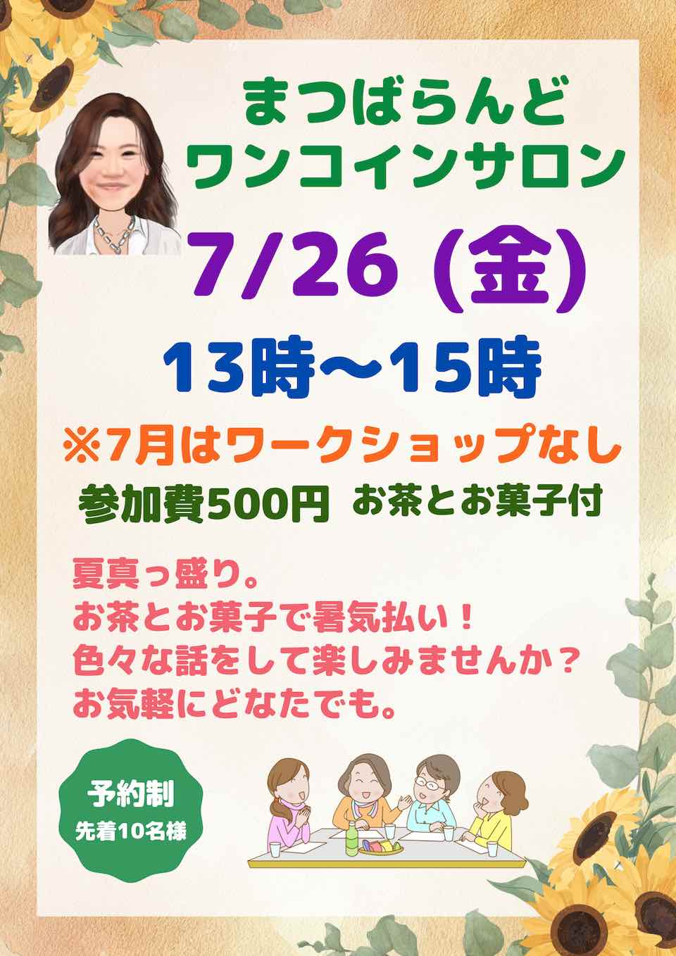 7月のワンコインサロンは7月26日(金)のみ、ワークショップなしの開催となります。8月は酷暑が予想されますので、お休みとなります。