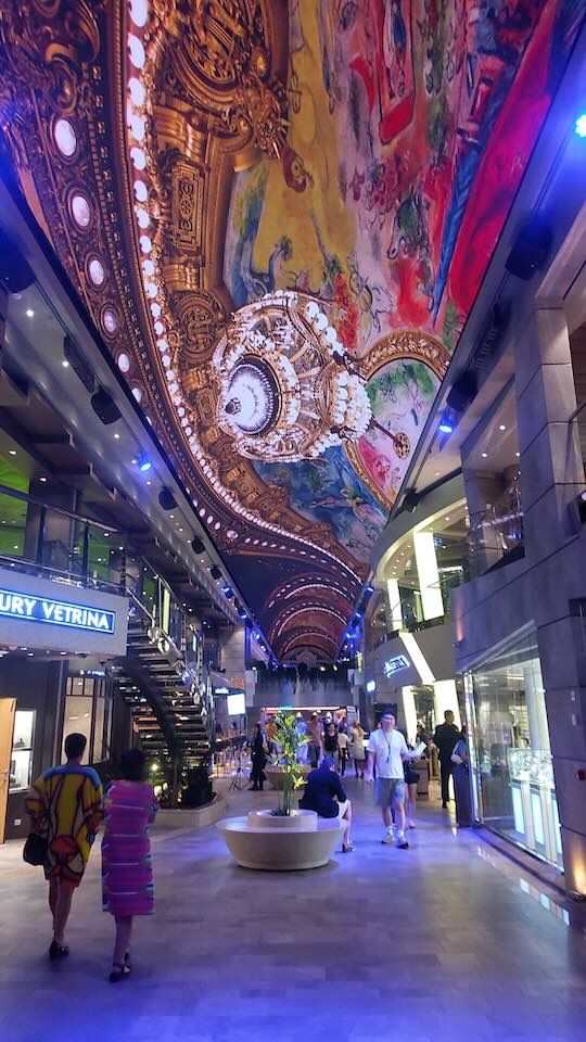 初めての経験ゆえ最初はお上りさん気分で巨大な船の中をウロウロ。外から見ると19階建ての巨大マンション、中はショッピングモールの感。全長300m超、私のキャビンはほぼ中央でしたがそれでもレストラン、ラウンジ、バーなどどこに行くのも歩かなければなりません。